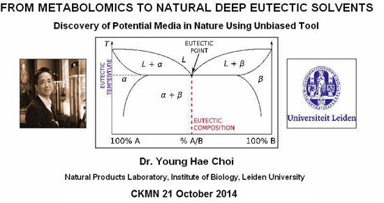 The group of natural products laboratory in Leiden University has been working for the metabolomics over 15 years, particularly for plants. Using the tool of metabolomics the group has found several important biological issues e.g. bioactive metabolites in the mixture, metabolites involved in plant defense mechanism, and chemo-marker for chemotaxonomy. Of the discoveries I would like to introduce natural deep eutectic solvents in this presentation.